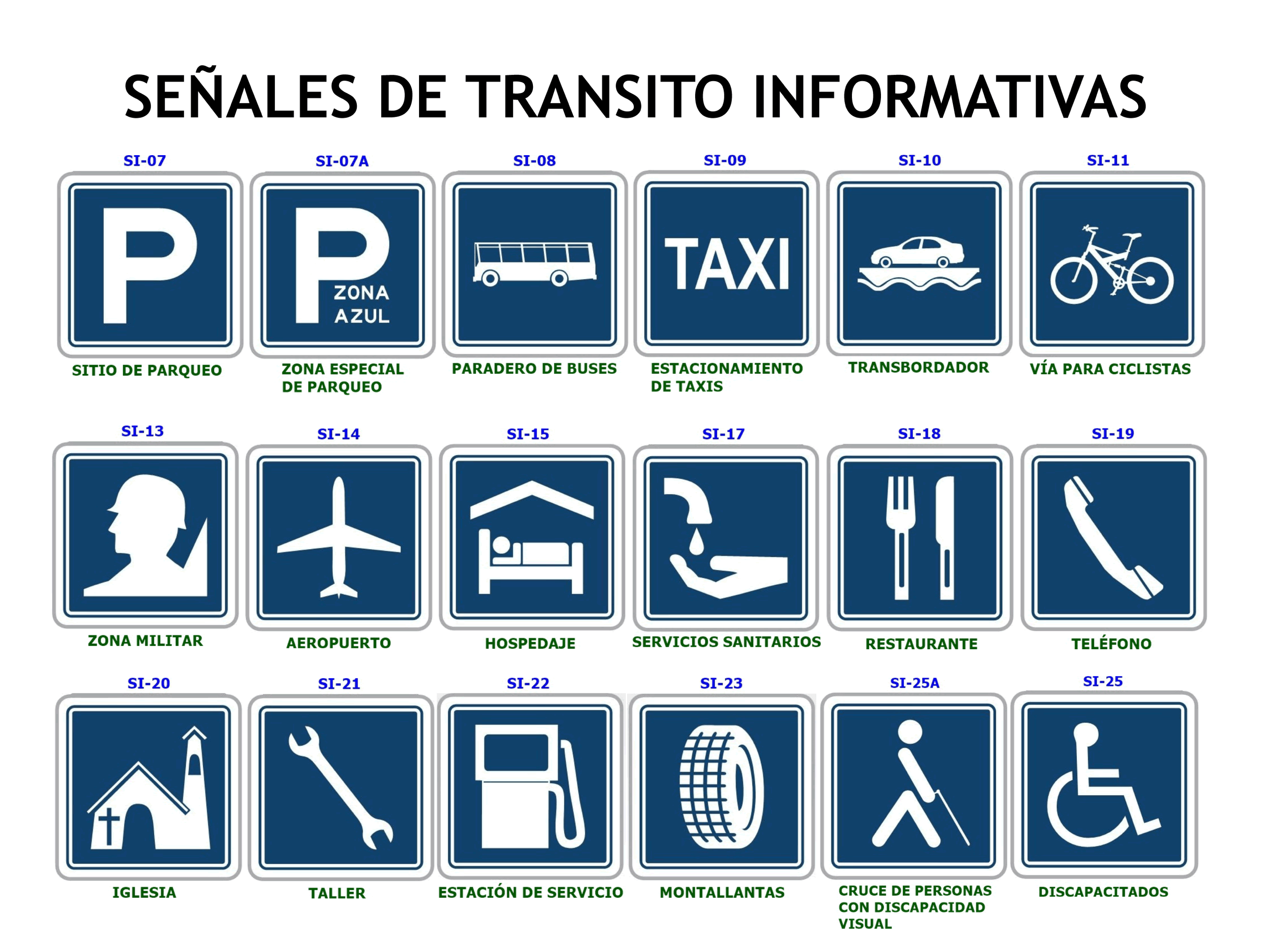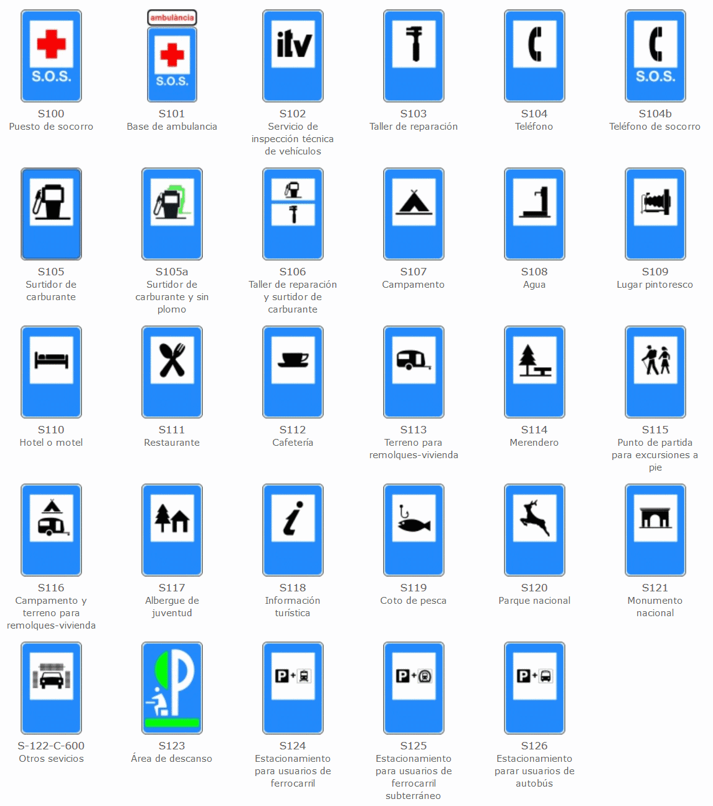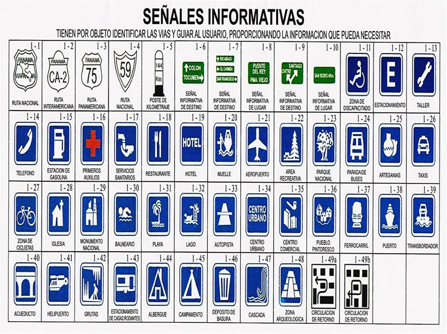 Como su nombre lo indica, su papel es proporcionar información, sobre los servicios y lugares que nos vamos a encontrar en el camino. Son de fondo azul con textos blancos y símbolos negros.